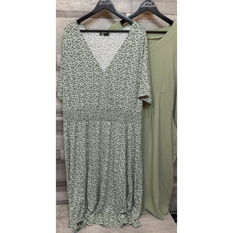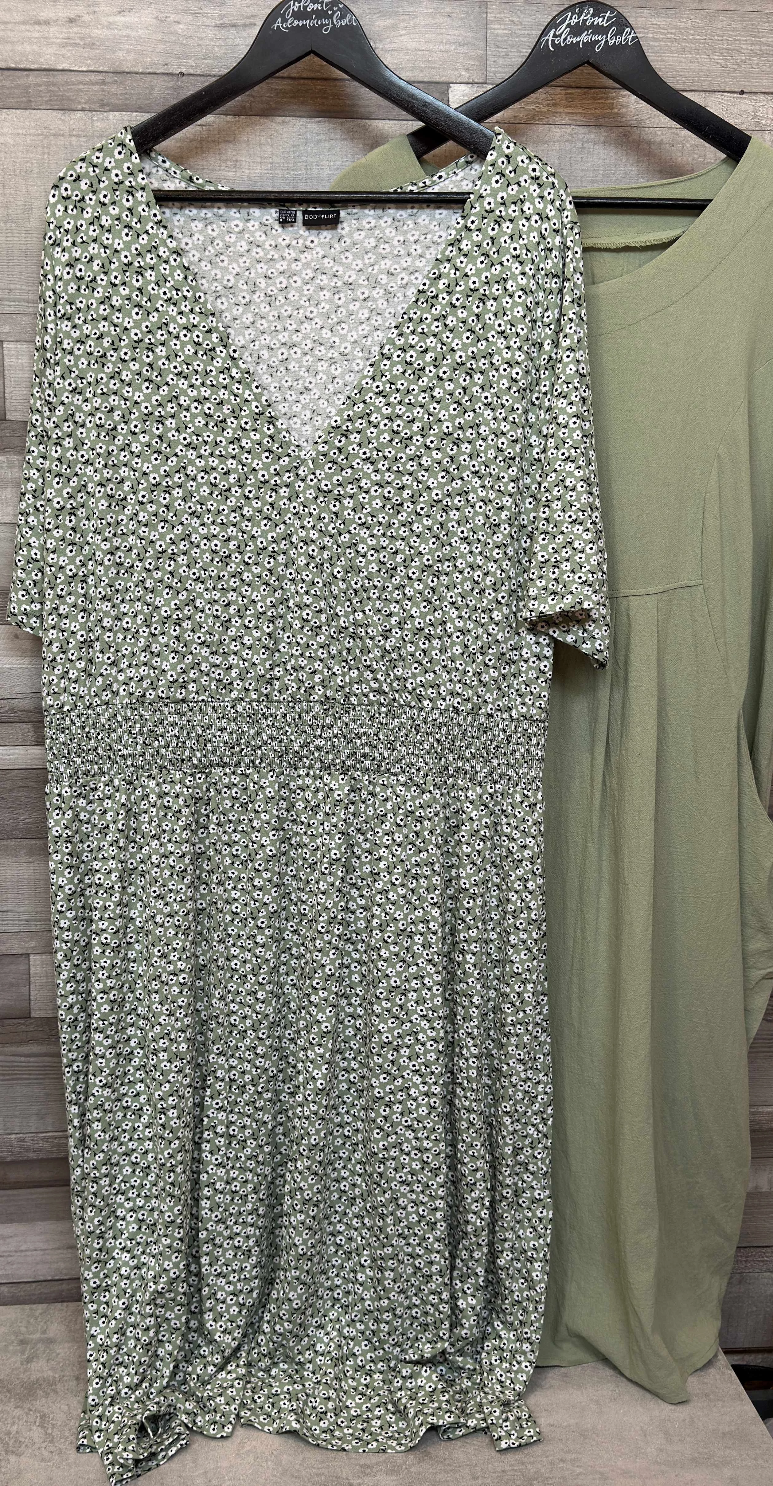 Ez a 2 darabos, 48/50-es méretű ruhaszett egy virágmintás, V-nyakú, derékban rugalmas maxi ruhát és egy letisztult, egyszínű olívazöld maxiruhát tartalmaz. Mindkét darab kényelmes, könnyű anyagból készült, így ideális választás a mindennapokra és kellemes, nyárias összeállításokhoz.