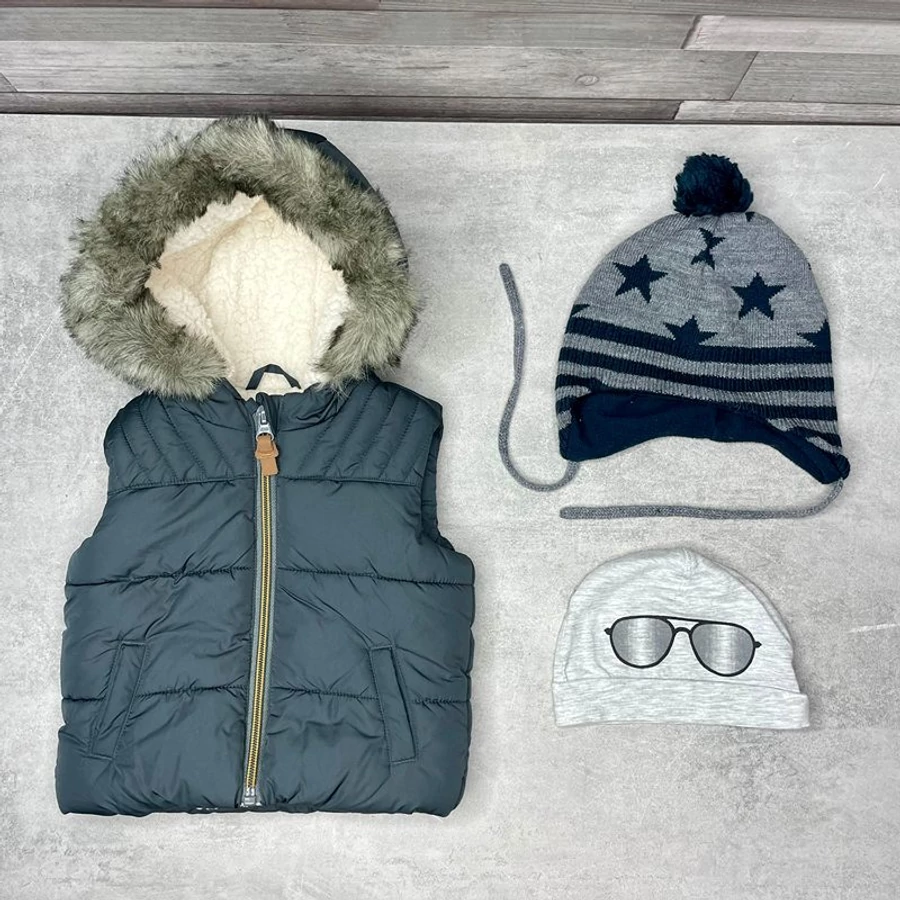 F&F Little Ones szürke bundás mellény két sapkával szett 3 hó