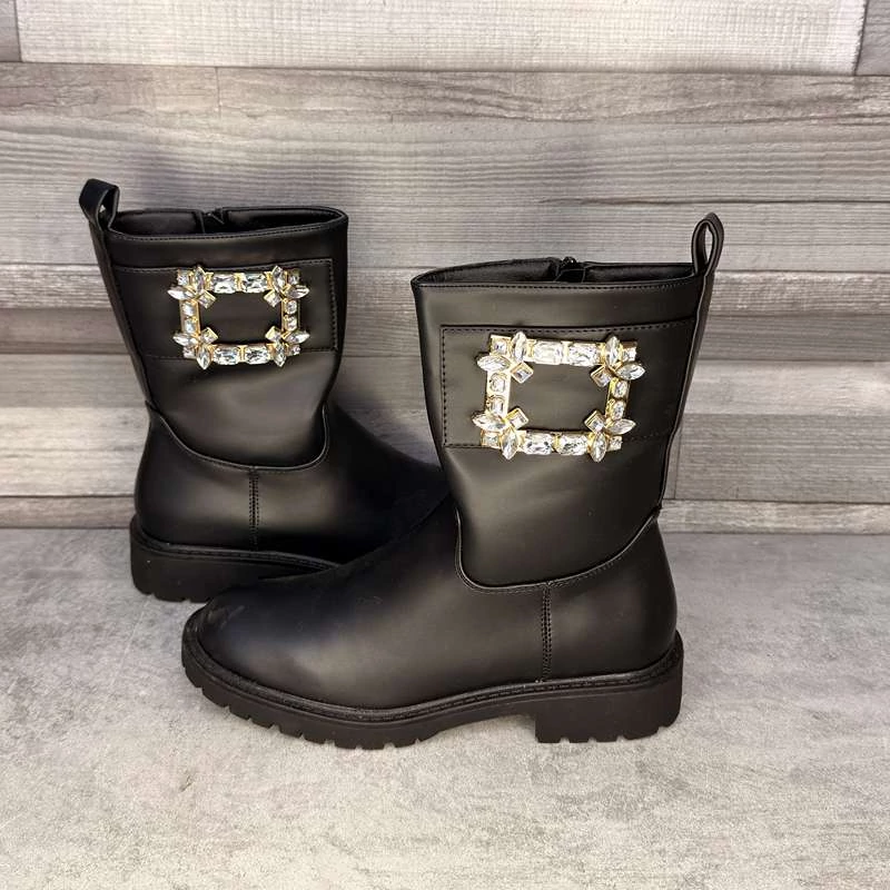 Ez a fekete műbőr csizma igazi „wow” darab: letisztult forma, de a csillogó, strasszos csat rögtön ellopja a show-t. Pont olyan cipő, amit felveszel, belenézel a tükörbe, és már érzed is, hogy ez a nap is csillogó lesz!