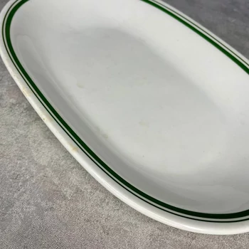 Alföldi porcelán zöld csíkos kis tálaló Letisztult, elegáns és pont olyan, mint amit a nagymama hétvégén elővesz a „szép szekrényből”. 26 x 16 x 3 cm Minimális kopással. 440 gramm |
