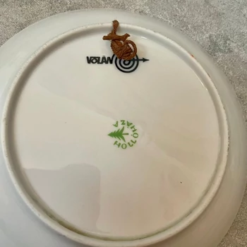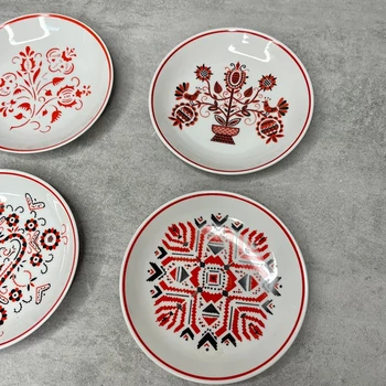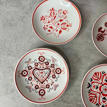 Hollóháza Hungary, Hollóházi porcelán piros-fekete mintás kisméretű fali dísztányérok Apró, de ütős karakterek a falon. Ezek a tányérok olyan színpompát hoznak, hogy még a fehér fal is megtapsolja őket. 4 db |