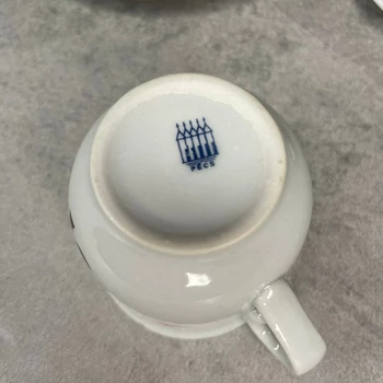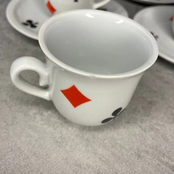 Zsolnay porcelán francia kártyamintás kávés szett A Zsolnay kávés szett francia kártya mintája azt üzeni, hogy a reggeli kávéval már a nap elején a szerencsédet is befolyásolhatod, vagy legalábbis elegánsan veszthetsz a lottón. 5 db csésze( 6 x 8 x 6 cm), 5 db kistányér (14 x 14 x 2 cm) +1 db enyhén csorba csésze 990 gramm |