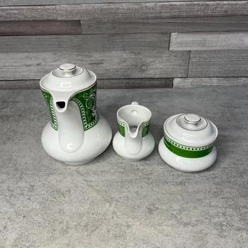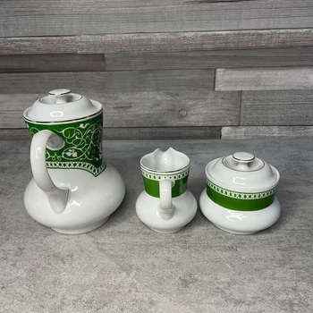 Hollóházi zöld mintás aranyozott porcelán kávés készlet Ez a Hollóházi készlet zöld mintájával és aranyozásával garantálja, hogy a reggeli kávé fogyasztása egy igazi, klasszikus magyar luxus élmény legyen, még akkor is, ha csak instant kávét iszol. Kanna 16 x 13 x 16 cm Össz. súly: 700 gramm |