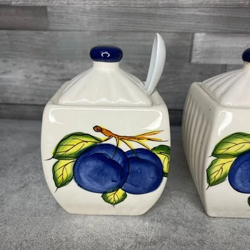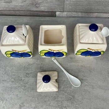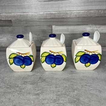 Szilvás kerámia fűszertartó szett Só, bors, paprika, vagy ennél izgalmasabb hármas ízesítő esztétikus tárolására, a gusztusos tálaláshoz három egyen kiskanállal. Mosható, így könnyen váltogatható ízvilágot garantál. 3 db (8 x 8 x 13 cm) |