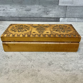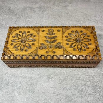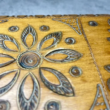 Régi retro fa népi doboz faragással, lemez díszítéssel Ez a doboz annyira népies, hogy a benne tartott apróságok is folklórt kezdenek énekelni. 24 x 11 x 6,5 cm |