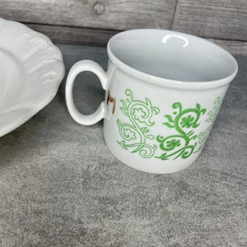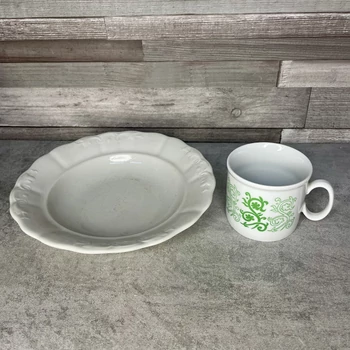 Zsolnay porcelán tányér zöld mintás bögrével Ez a Zsolnay porcelán összeállítás a bizonyíték arra, hogy a konyhai kellékek is lehetnek műalkotások. A zöld mintázat klasszikus és megnyugtató, a bögre pedig tökéletes kiegészítője a tányérnak. Kényeztesd magad egy adag minőséggel a reggeli kávé mellé! Mélytányér: 23 x 23 x 5 cm Mérsékelt kopásokkal. |