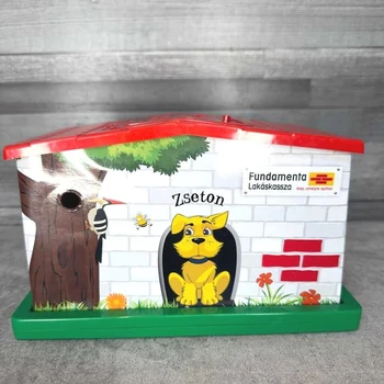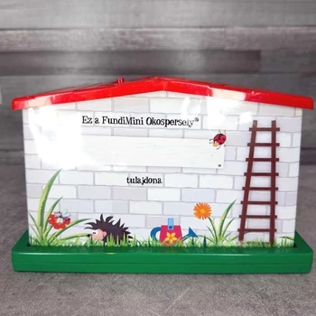 Fundamenta Lakáskassza Zseton gyerek okos persely Takarékosság már gyermekkorban? Itt a megoldás! Vidám, házikó formájú gyerek persely „Zseton” figurával, Fundamenta Lakáskassza felirattal. Strapabíró műanyagból készült, könnyen nyitható aljjal, ideális aprópénz gyűjtésére. Gyerekeknek kedves, dekoratív darab, de reklámtárgy-gyűjtőknek is érdekes lehet. 21x11x13 cm |