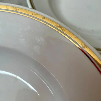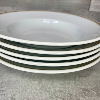 Zsolnay arany szélű porcelán mélytányér szett Ez nem az a tányér, amibe csak úgy belekanalazol, hanem amibe illik beleszeretni egy kicsit. Finoman aranyozott, elegánsan fennhéjázó, és egyértelműen tudja, hogy nem hétköznapi leveseknek született. 5 db, minimális kopással 23 x 23 x 4,5 cm |