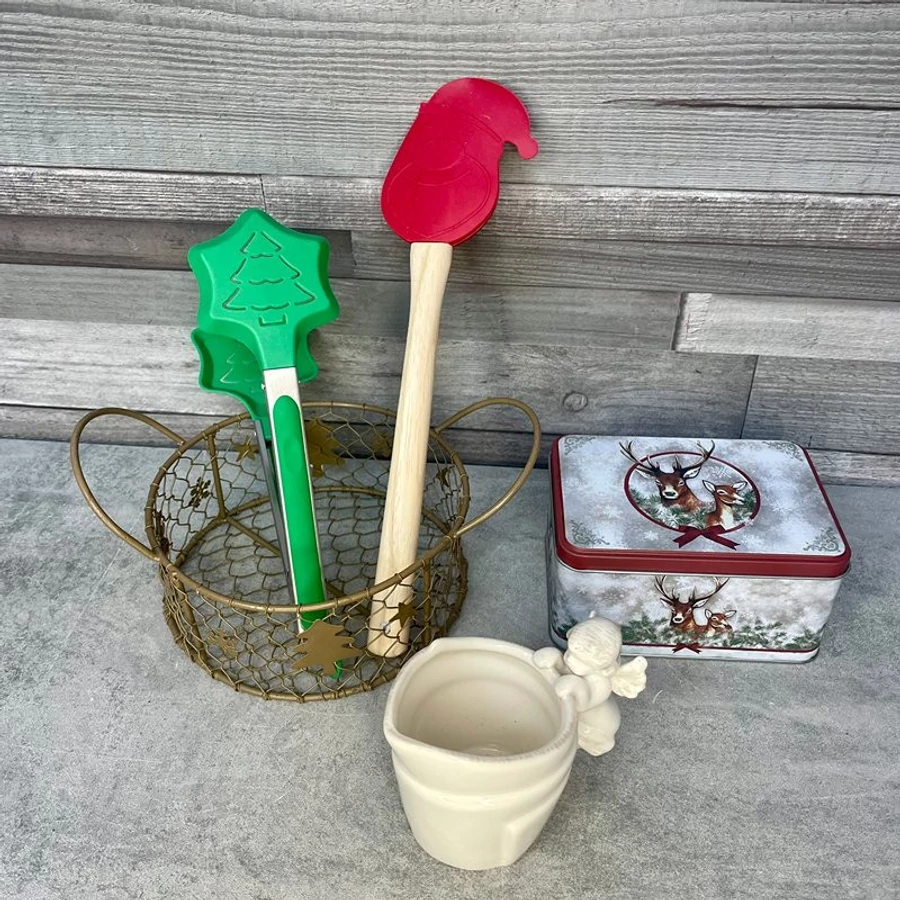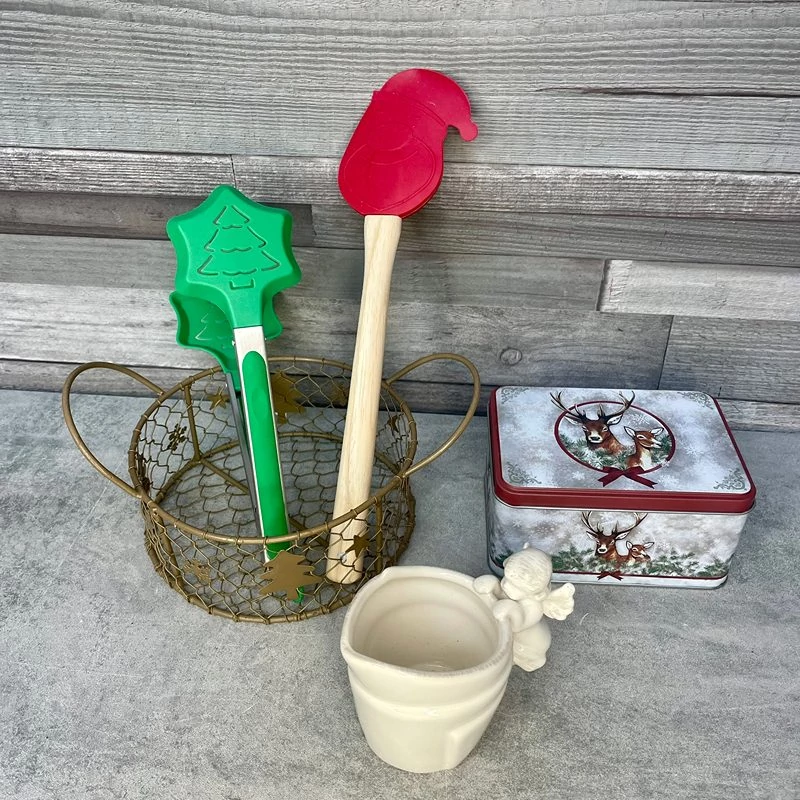 Fém kosárka, konyhai kiegészítők, kerámia angyalos kiöntő, szarvasos doboz.
