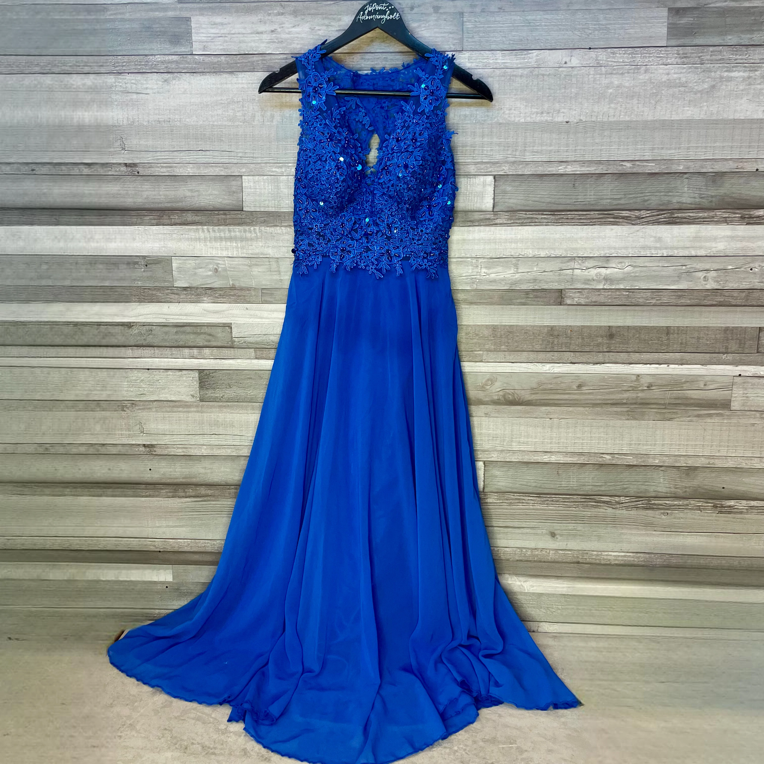 Királykék csipkés, gyöngy díszítéses hosszú alkalmi ruha S-M
