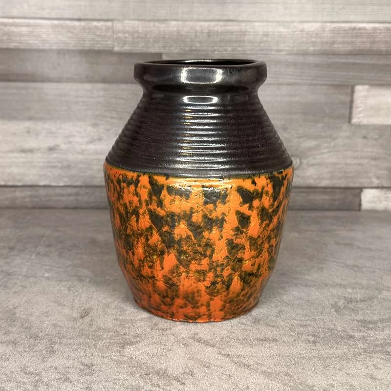 Narancs mintás iparművész kerámia váza fekete peremmel