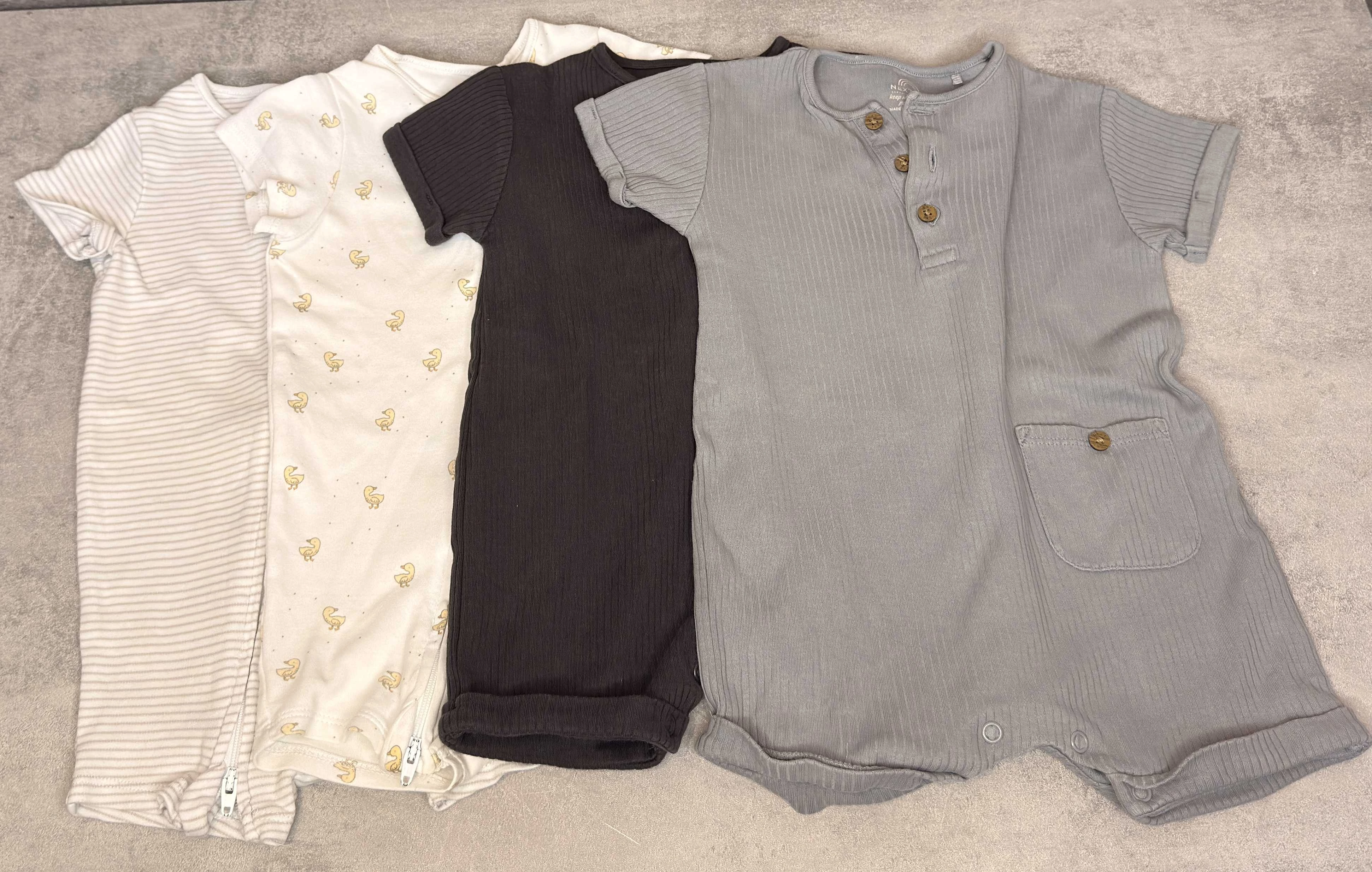 Ez a 4 darabos baba rugdalózó és body szett kényelmes, puha anyagból készült, különböző neutrális színekkel és visszafogott mintákkal.