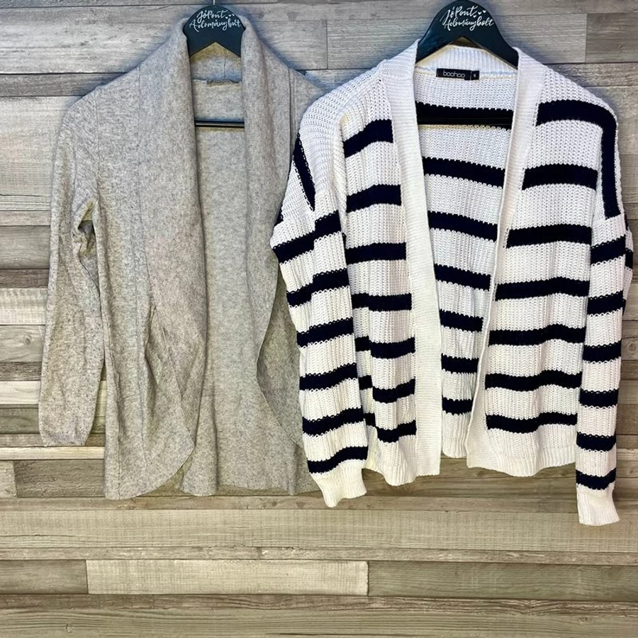 Két kötött, kényelmes kardigán, ami elegánsan elrejti a téli nassolás nyomait, miközben az S-es méret azt ígéri, hogy még mindig "kicsi" vagy. Ideális az őszi-téli réteges öltözködéshez!