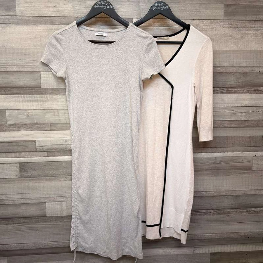 Ez a két darabból álló női ruha szett egy világosszürke, rövid ujjú, oldalán húzott fazonú ruhát és egy krémszínű, fekete szegélyekkel díszített, háromnegyedes ujjú ruhát tartalmaz. Mindkét darab kényelmes, puha anyagból készült, így ideális választás a mindennapokra.