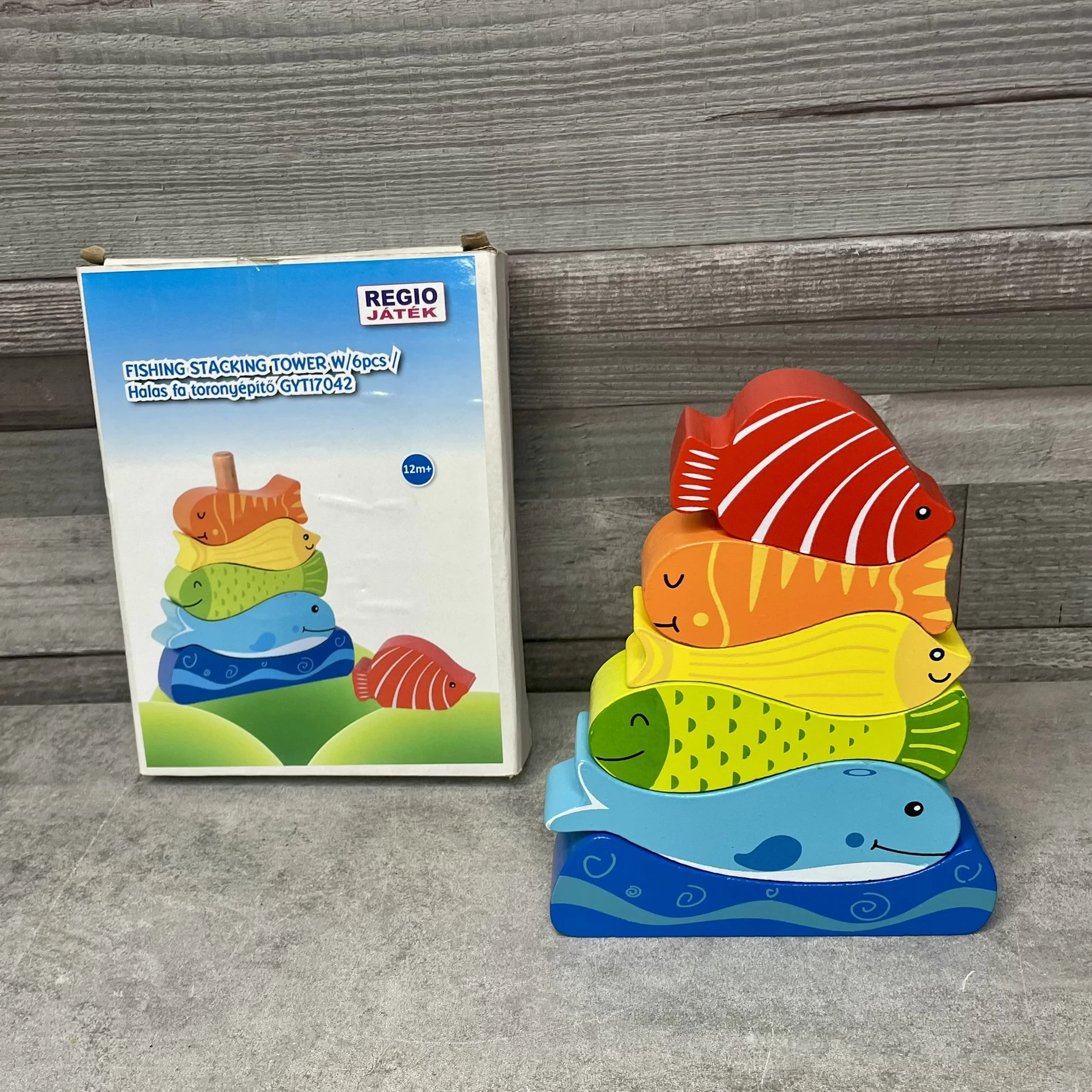 Egy fa toronyépítő, aminek halas a mintája. Egyszerű, mint a faék (szó szerint), de leköti a gyereket, amíg te megiszod a kávéd. Fejleszti a kézügyességet és a türelmet – utóbbit nálad is, amikor tizedszerre dől le a torony a nappali közepén.