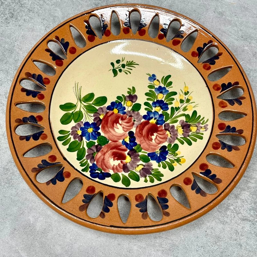Ez az áttört virágmintás majolika fali tányér nemcsak a falat díszíti, hanem egy egész konyhát is felvirágoztat. Igazi retro hangulatú darab, amely egy kis vidámságot hoz a reggeli kávé mellé. Csak vigyázz, mert a virágok túlságosan szépek, még a szomszéd is kölcsönkérheti! Igazi kézműves csoda!