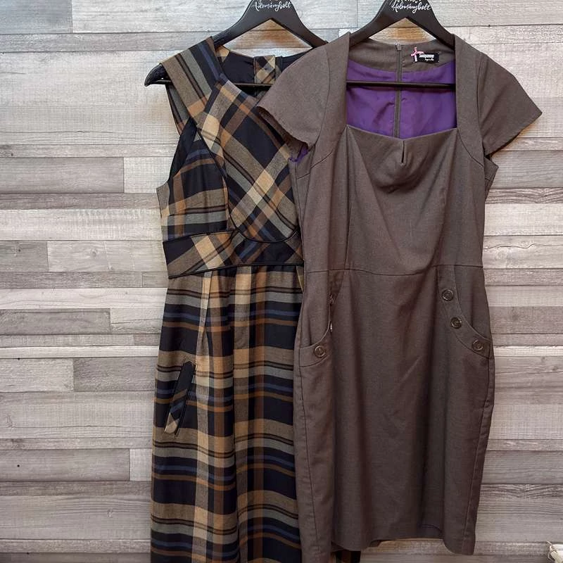 Két különböző stílus, mégis jól kombinálható ruha egy csomagban: az egyik barna–fekete kockás, ujjatlan fazon, a másik egyszínű barna, rövid ujjú, zsebes megoldással. Könnyen feldobható csizmával, balerinával vagy egy kardigánnal.